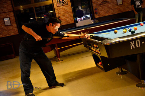 「エイトボールが主流で、後にシックスボールですね。これは手でもすぐラックが組めるからです。その後、ナインボールのジャパン(人数撞き。③⑤⑦⑨が点球)です。最近はテンボールでもやりますね(③⑤⑦⑩)。相手は、僕が若い頃は外国人が多かったです。徐々に沖縄の人が増えていって、沖縄の人間同士でやるようになっていきましたね」