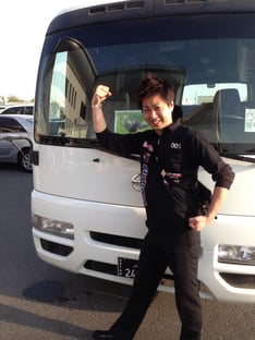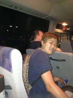 「会場からの帰りのバスでヒョウ柄のリュックを背負ってる僕(笑)。連日38度の炎天下の中歩いて会場に行ってるので着替えがいります(笑)」