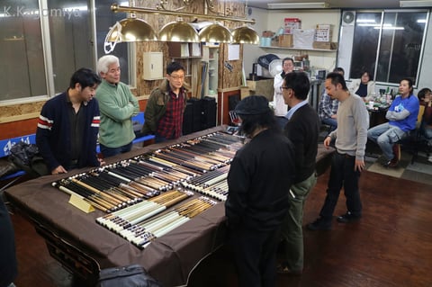 テーブルいっぱいに並べられたカスタムキュー。