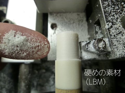 硬めの素材は削ると細かい粉になっているのに対し、