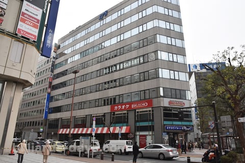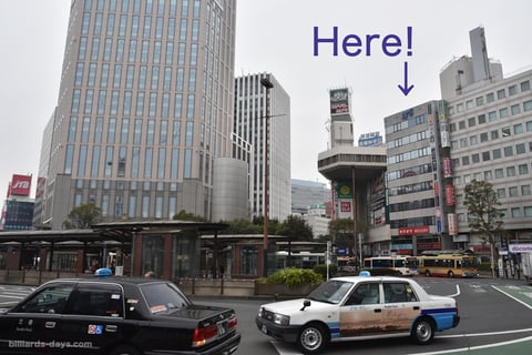 ロータリーを挟んだ向こう側に目指すビルが見えています。