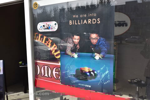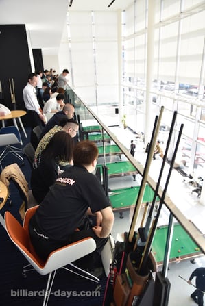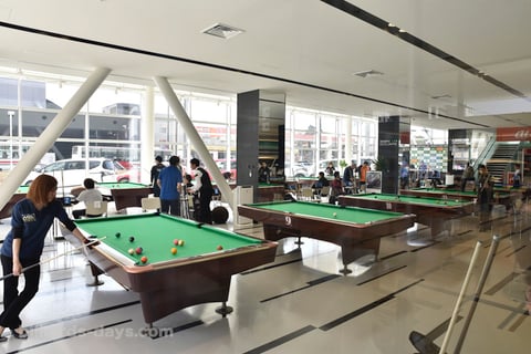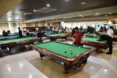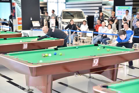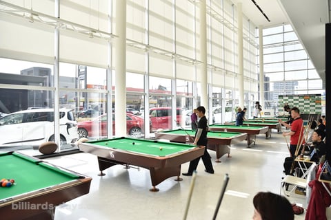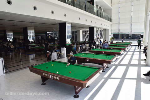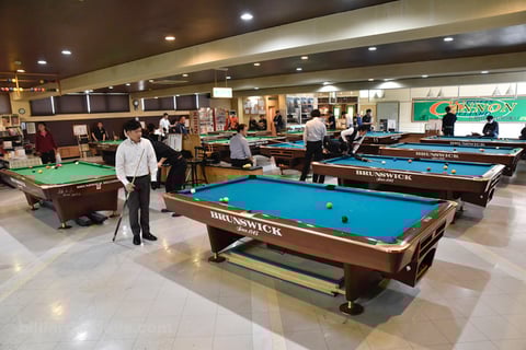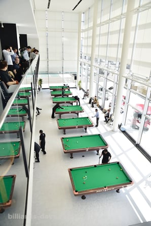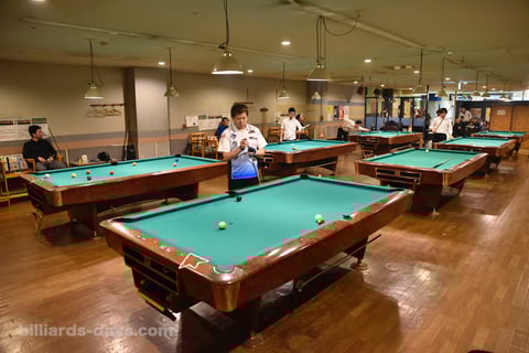 ビリヤードテーブルが並べられた様は