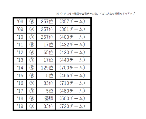 WPC各年度の日本勢最高位を書き出してみましたが、年々アベレージが上がってきているのがよくわかります。今年はTAKKAN(達観)チームがチャンピオンシップアリーナでプレーできましたが、いずれまたその機会はやって来るでしょう。