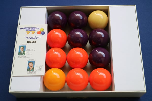 1枚目:ボーナスボール99のボールセット。手玉も含めて、数字やロゴは一切ない、スヌーカー用ボールのような雰囲気。れっきとしたアラミス社製だ