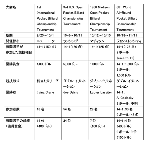 『日本ビリヤード新聞』昭和41年(1966年)5月号(第13号)の『=特集=アメリカ・ビリヤード界の昨今』という特集記事の『アメリカにおけるポケットビリヤード界の現況』において、藤間選手はこのときの様子を次のように振り返っています: