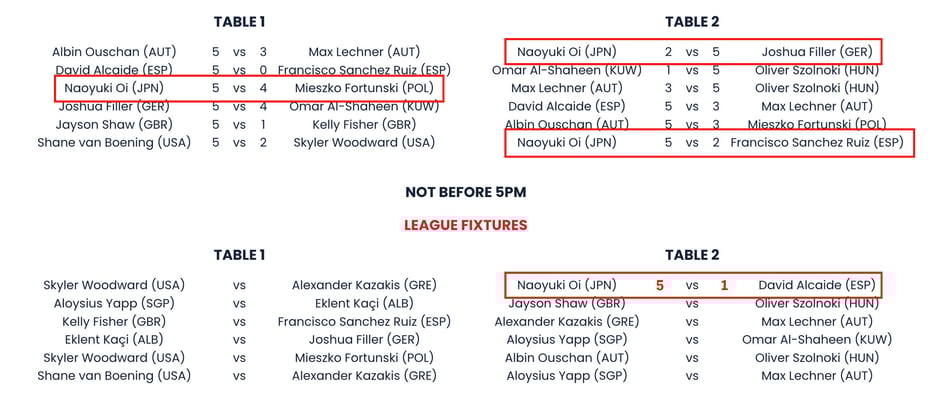 Naoyuki Oi has beaten David Alcaide 5-1 to go top of the group with his third win of the day. Alcaide tastes defeat for the first time..#PremierLeaguePool pic.twitter.com/tZV3vIsO2C