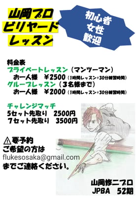 「ゼロから学びたい初心者や女性の方、伸び悩んでいるBCクラスの方など、どんな方でも歓迎です。個人的にフルークスさんによく練習しに来ていますが、ビリヤード好きが集まっていて楽しい雰囲気で、集中して撞ける素晴らしい環境です。レッスン場所としても理想的ですね。上達したいという方や僕と対戦したい方、お気軽にメールでお問い合わせください」(山岡プロ)