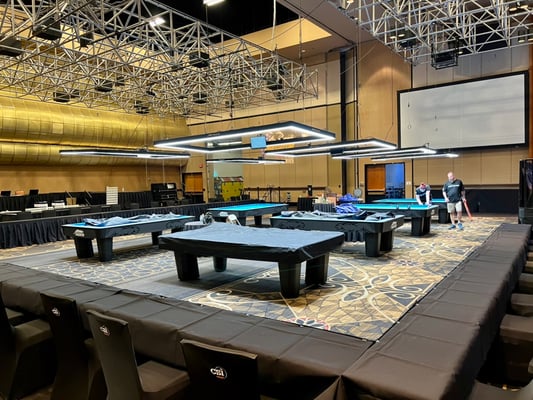 夜、プレイヤーズミーティングがあるので会場へ。プロアリーナはまだ準備中で完成してなかったですが、今年はTVテーブルを含め合計14台が設置されるようです。昨年は8台でした。前回からプラスして女子の大会と3クッションワールドカップ(隣の大広間で設営中)も開催されるので華やかになりそうですね。