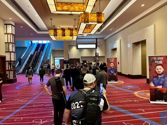 大会前日。会場ロビーでプレイヤーパスを受け取る選手たちの長い列