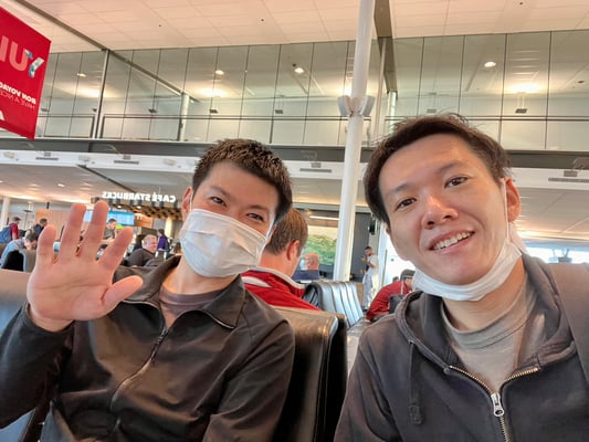 1枚目:乗り継ぎのモントリオール空港で照屋勝司プロ(左)と