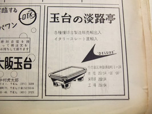 関西と関東を代表する、老舗のビリヤード用品会社です。両社の広告は『日本ビリヤード新聞』の創刊号から最終号までほぼ毎月掲載されたようです(※現在淡路亭はビリヤード用品は取り扱っていません)。