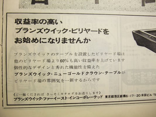 アメリカを代表するビリヤード・ボウリング用品の会社『ブランズウィック』の日本支店がありました(※現在は『日勝亭』が日本国内総代理店です)。当時はブランズウィック製のキャロムテーブル(中台)も販売されていたようです。