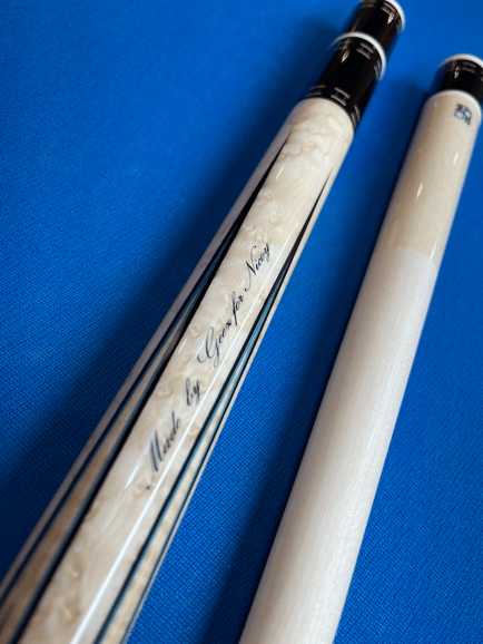 「現在はインレイキューが多いビリヤードキュー市場ですが、Geez Cueはあえてインレイを一切使用しない、昔ながらの製法の本ハギ仕様となっています」