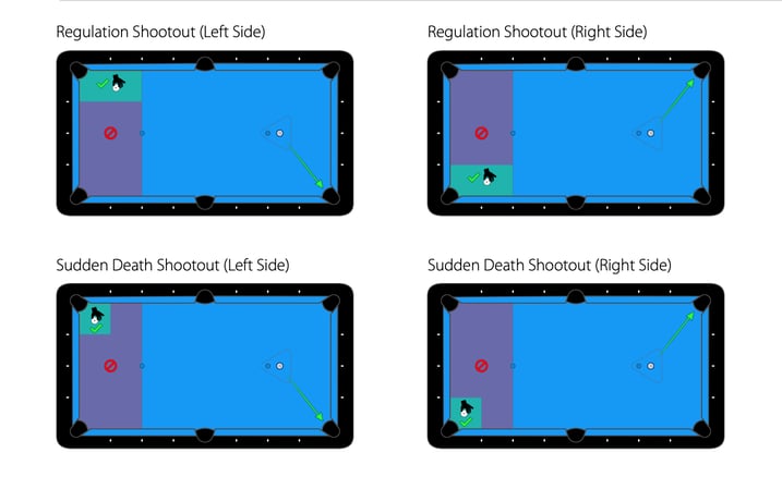 赤:難しいです。練習ならまだしも、実戦でPK戦みたいな方式で撞くとそんなに入れられる気はしてません。僕はこれまで4回本番でシュートアウトを撞きましたけど(そのうち3回勝利)、本番では正直球が入るイメージがあまりないまま構えに入ってますね。プレデター系トーナメントで使っているテーブルも穴幅をどんどん絞っているので余計に入る気がしないです。トッププレイヤー達もちょっとでも撞点とスピードがイメージとズレたらすぐ失敗する球だと思います。会場で他の人が撞いてるのを見て、「皆、よく入れてるなぁ」と思います(笑)。