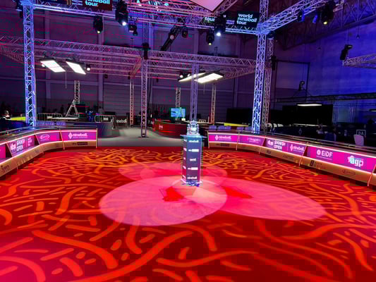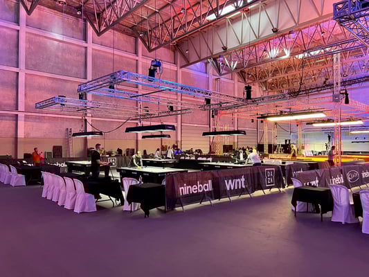 大会前日のプラクティスタイムで撮った画像をいくつか。会場内のレイアウトはマッチルームのいつもの「それ」で、広々とした空間にプラクティステーブルを含めると30台ほどが設置されています。照明も暗めで雰囲気はGOOD。プレイヤーの方には一度で良いからこの素晴らしい空間を味わってみて欲しいです。