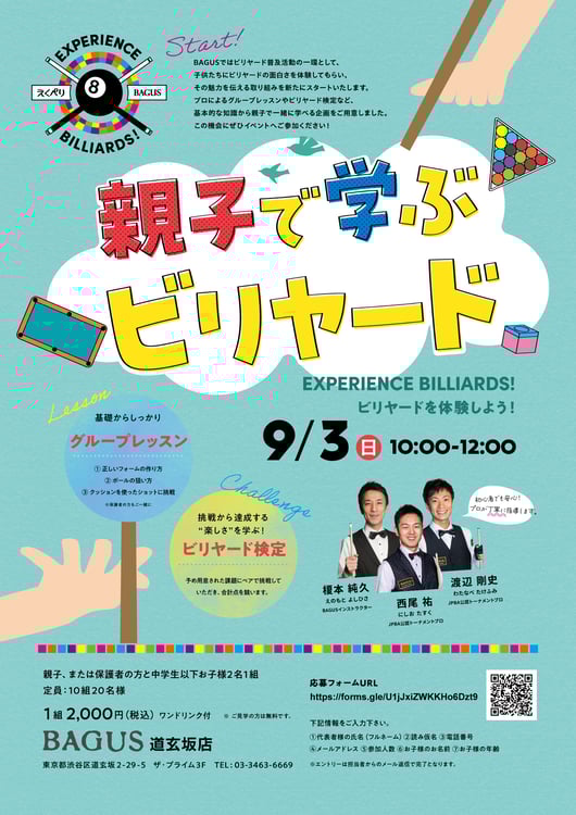 「バグースでは7月より親子でビリヤードを楽しんでいただく『キッズビリヤードキャンペーン』を開催し、多くのお子様、ご家族にご利用いただいております。さらに本格的に親子でビリヤードを学ぶ機会として『Experience Billiards!~ビリヤードを体験しよう!~』を渋谷で開催する運びとなりました。