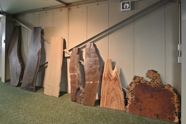 様々な銘木の板材。