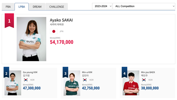 LPBAシーズンランキングは暫定1位に。