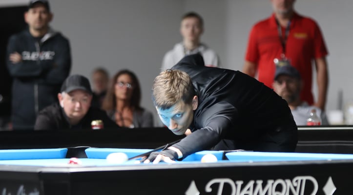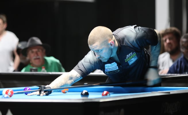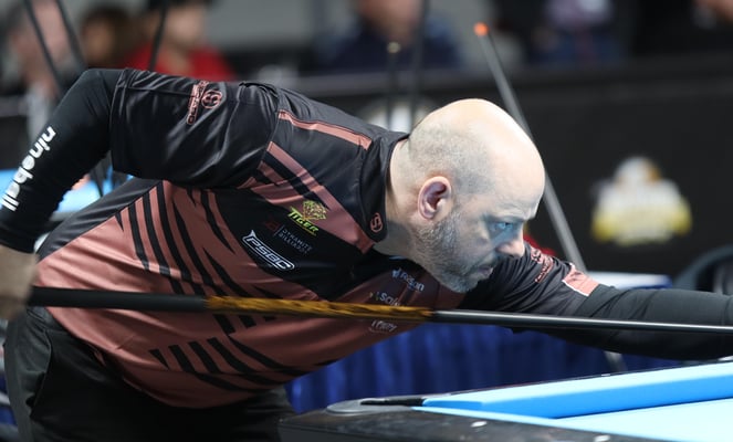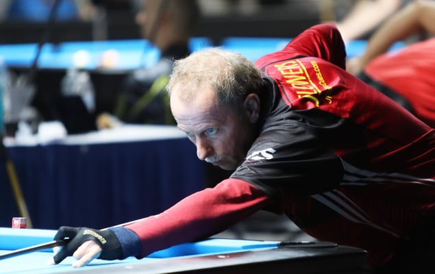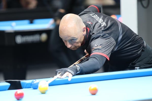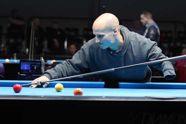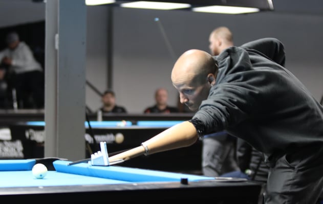 義手のプレイヤー、マシュー・ブルゾゾフスキ(Matthew Brzozowski)。撞き位置によって逆手でショットしていた