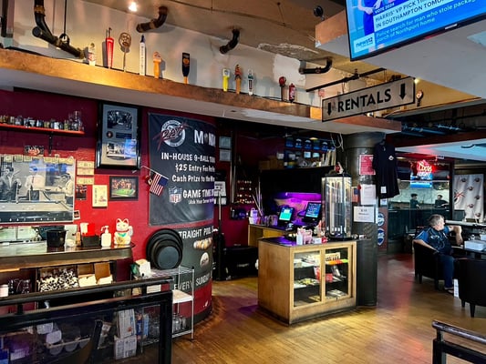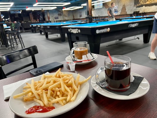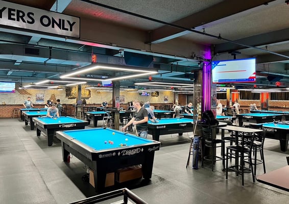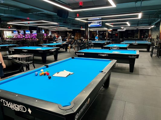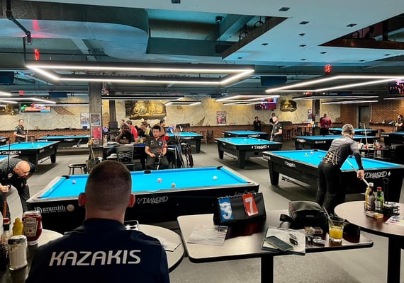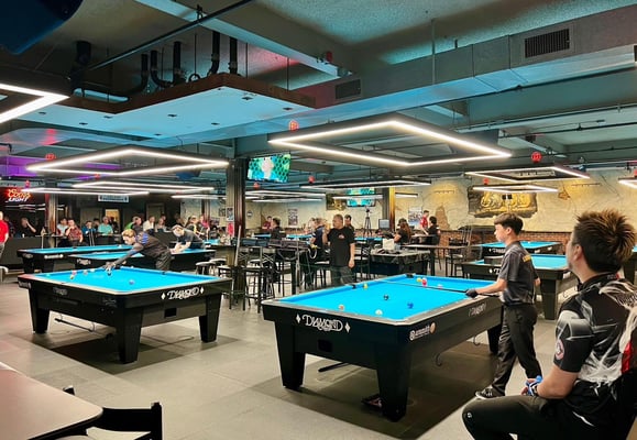 1フロアにダイヤモンドの9フィートテーブルが21台、7フィートテーブルが8台と、29台設置された巨大店舗。その他大型モニターに、テーブル席、20人ほど座れるであろうバーカウンターまで設置されていました。フードメニューも充実していました。大会前に2日間練習に行きましたが、3~4時間ほど練習して、ドリンクも頼んで大体毎回40ドルぐらいでした。1時間1テーブル10ドルぐらいでしょうか。