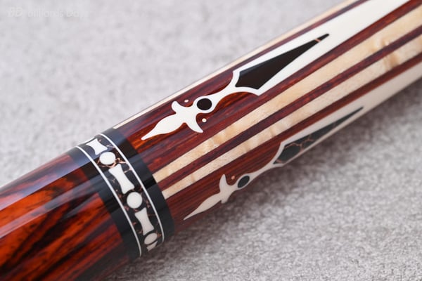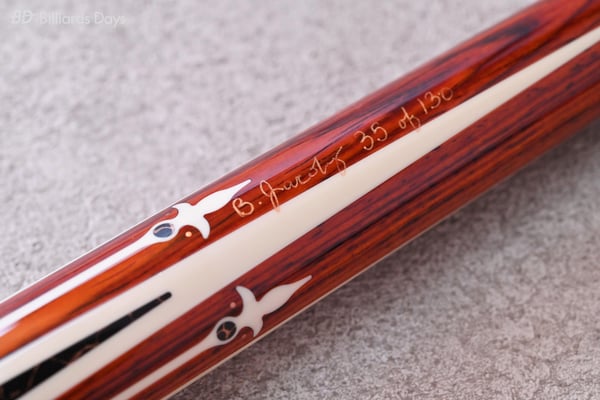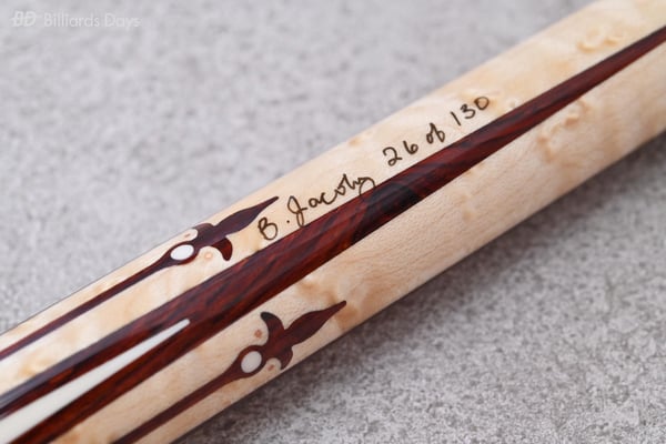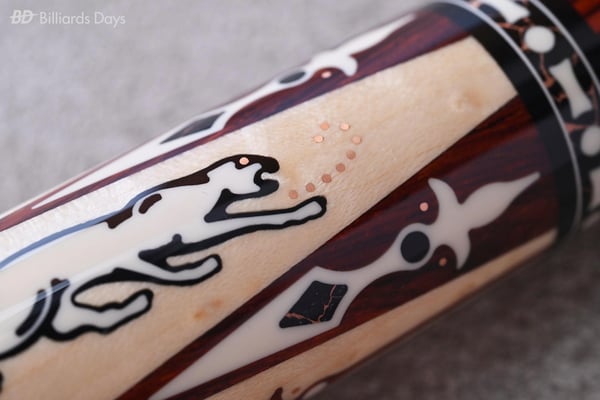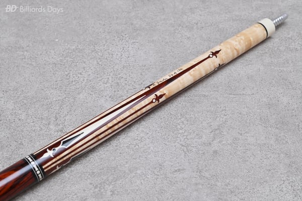 「Pantheraの9世代目、『Nitara』がついに登場しました。アメリカの人気キューメーカーJacobyとのコラボデザインによるPanthera Nitaraは、大胆で美しいデザインで皆様を永遠に魅了します。バーズアイメイプルとココボロをベースに、ミカルタやローズゴールド、カッパーによる繊細な模様が施された本当に見事な逸品です。9-1、9-2モデルとも全世界限定でそれぞれ130本生産。各キューに個別にサインと番号が彫り込まれています」