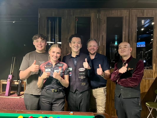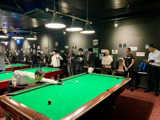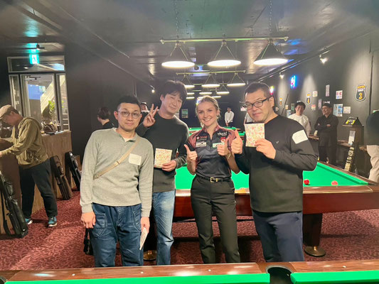 全チャレンジが終了した後、最後に僕とアナのエキシビションマッチを2ラック先取の9ボール交代ブレイクで実施。アナを日本へ招待したスポンサーのJEP会長・上ノ原さん(画像2枚目)より賞金も用意されました。もちろん参加者の皆さまからのガヤが入り、僕は完全アウェイでした(笑)。結果はアナが2-1で勝利。その後、集合写真を撮って閉会となりました。終了時刻は21時50分とほぼ予定通りスムーズに進行しました。
