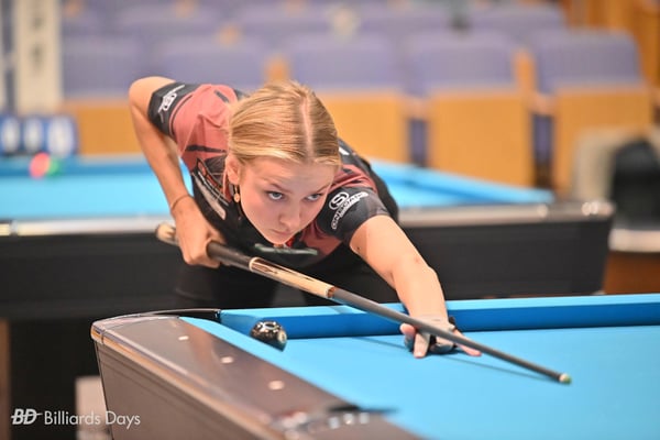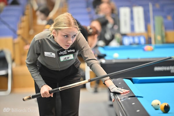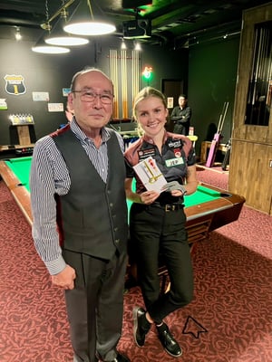 まず佐原弘子プロとの接戦を制して日本初勝利。2戦目では大会準優勝の中国のワンシャオトンに完敗。3戦目の敗者最終戦は高田奈実プロとシーソーゲームの熱戦。6-5と先にリーチをかけた残り4球は良い配置。しかし、「押して出すか引いて出すかを迷った」という5番をミスしてしまい、逆転負け。さすがに試合終了後は落ち込んでいました。