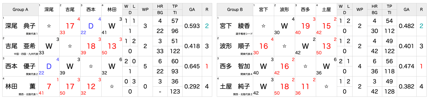 決勝リーグ:4名×2組(20点ゲーム)、