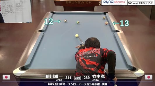 竹中:いやぁ、あれは13番に当てて出せなかったのでセーフティしただけです(苦笑)。最初から12番を入れながら手球を13番に当てに行くつもりでネキストを出したんですけど、12番がちょっと厚くなってしまって(※↑上の画像)。なので、弾かせ気味で右上を撞いたんですけど、押しがかからなくて13番に当てられなかったです。