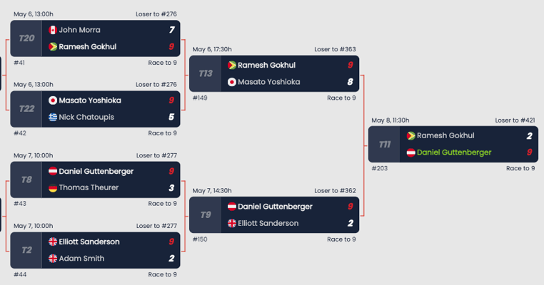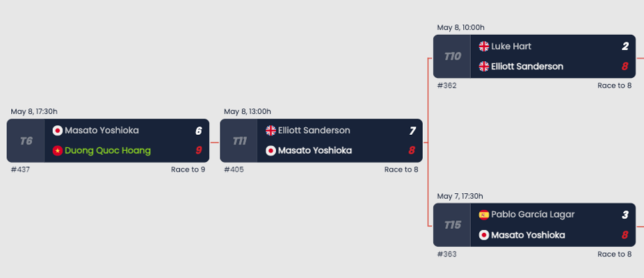 続く敗者3回戦は地元イギリスのE・サンダーソン選手。スピーディーなプレーをするサンダーソン選手となかなか良い戦いが出来て、5-7で先にリーチをかけられてからワンチャンスが来て、取り切り&2連マス上がりとプレーの質を徐々に上げていけました。