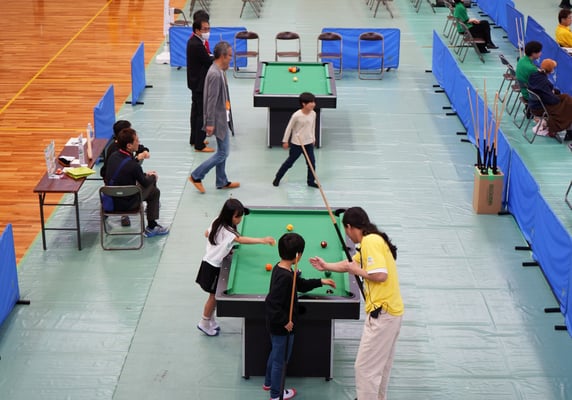 また、今大会のもう一つの趣旨として、ミニテーブル2台と試合用の空きテーブルを利用して、来場していただいた一般のお客様にビリヤードを体験してもらいました。これが思いの外大好評で「すごく楽しかった」「難しいけどポケット出来た時はめちゃくちゃ気持ちいい」「ビリヤードはどこに行けば出来るのですか?」など様々な感想や問い合わせを頂戴することが出来ました。大会2日目になると、決勝トーナメントということもあり好ゲームの連発で、観客だけではなく、ビリヤード体験に来られた方も熱心に観戦されていたのが印象的でした。