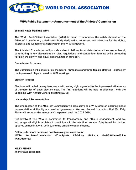 世界プールビリヤード協会(WPA)は、「WPAアスリート委員会」の設立を誇りを持って発表いたします。