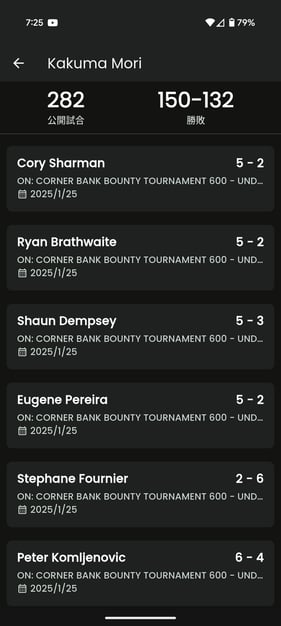 過去の対戦データが見られ、検索も可能です。