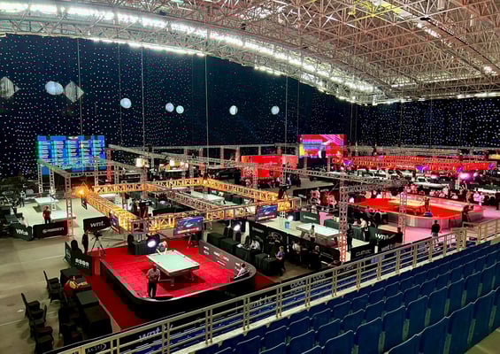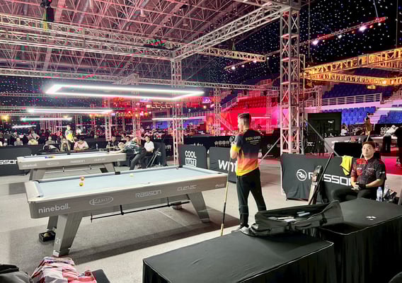 テーブルはメインTV台の「TTV」を入れて32台。全てラッソン(RASSON)です。会場の暑さ、湿気、そして4インチポケット(ボール1.7個分の狭い穴幅)も相まって、WNT.メジャー大会のテーブルセッティングの中でも1、2を争うタフなコンディションだと感じました。みんな手こずっている様子でした、一部のトップ選手を除いては。