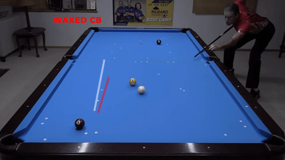 キック・アンド・スティックショット(空クッションで全厚に当てるショット)の際は、通常の手球だと無回転で的球に当たり、手球がその位置で止まるため成功率が高い。横回転はクッションへの入射角によるものだ。ワックスの効いた手球で同様のショットをすると、上回転が残ることで的球に当たったあと引きがかかった動きになる。ワックスをかけたばかりの手球だと、このように影響がわかりやすい。