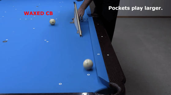 また、ワックスのかかった球はポケットの受けを広くする。特に浅い入射角の場合は顕著だ。近年のプロトーナメントで見られる渋いポケットは難しそうに見えるが、非常に滑るコンディションでクッションとほぼ平行に入った場合、その見た目よりはポケットが広がるのだ。