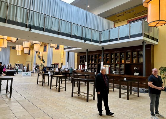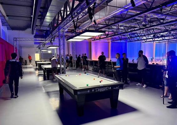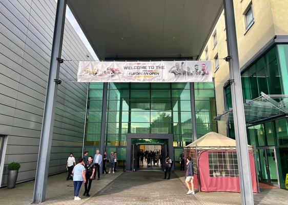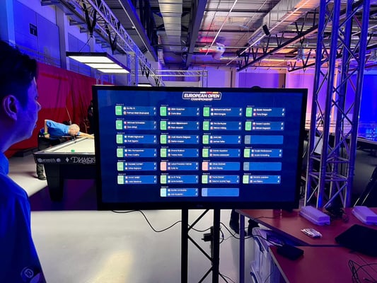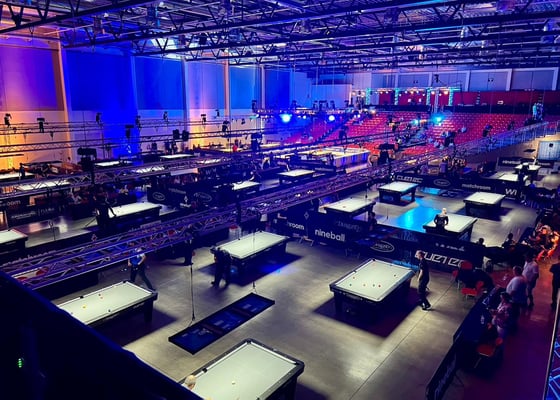 会場内の雰囲気はいつものマッチルームメジャー大会のそれ。1階にテーブルが26台、2階には4台のプラクティステーブルがあります(最後の3枚が2階の画像)。上からも見渡せるし、テレビテーブルの横にはひな壇式の観客席が広がり、とても観戦がしやすい会場でした。